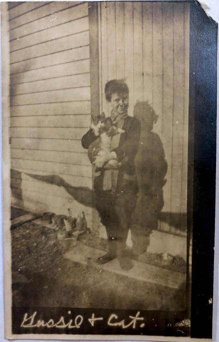 I especially liked this card because at the top in a careful hand it reads, This is kitty Beall, taken by Mrs. Beall – out in our backyards. E.A.M. The postcard is addressed to Miss Grace Ethel Kingsbury, Braintree, MA 115 River Street. (In that order oddly – the street name and number at the bottom.) The postmark is obscured and the only thing I can make out is Fergus Falls MINN. The date is illegible, but luckily the folks in Braintree also stamped it as received at 9AM on July 14, 1907. (In high school I had a boyfriend who came to New Jersey from Braintree and the exoticism of the name of the locale stuck with me all these years. Stephen O’Shaughnessy. He collected and restored old cars. As a result we were always getting stranded somewhere when the cars would break down or the gas gauge turned out to be broken. The charm of tooling around in an MG from from the 1960’s balanced against this annoying flaw. Although we remained friends, I’m sorry to say I ultimately lost track of him. He was a very nice person)