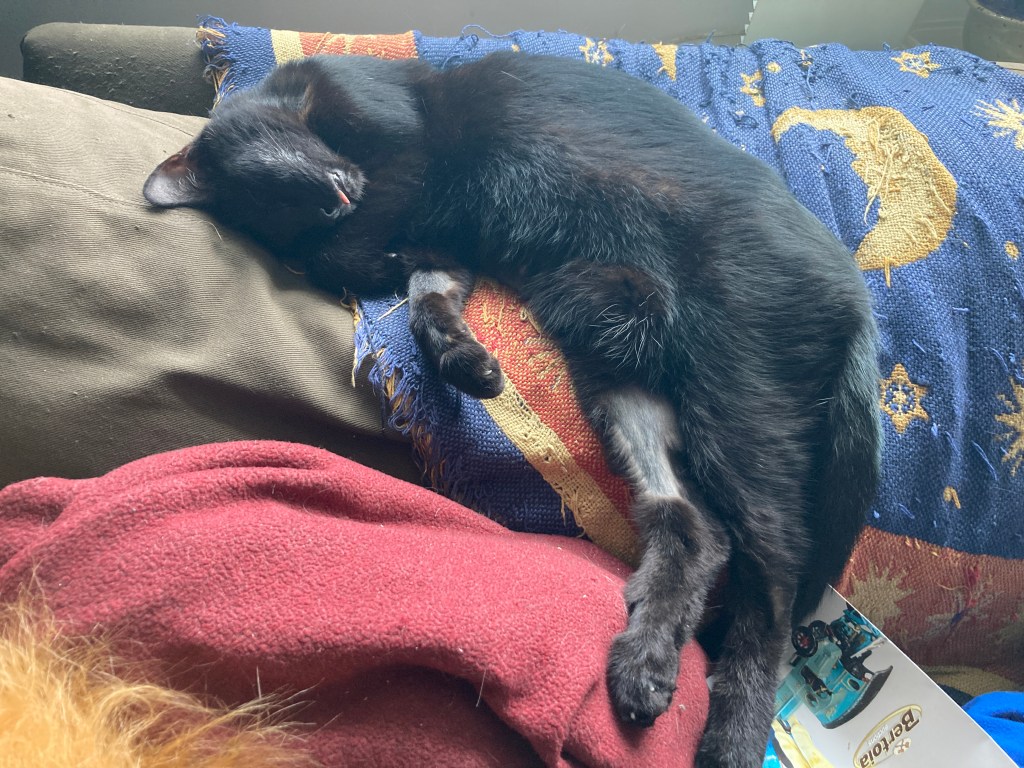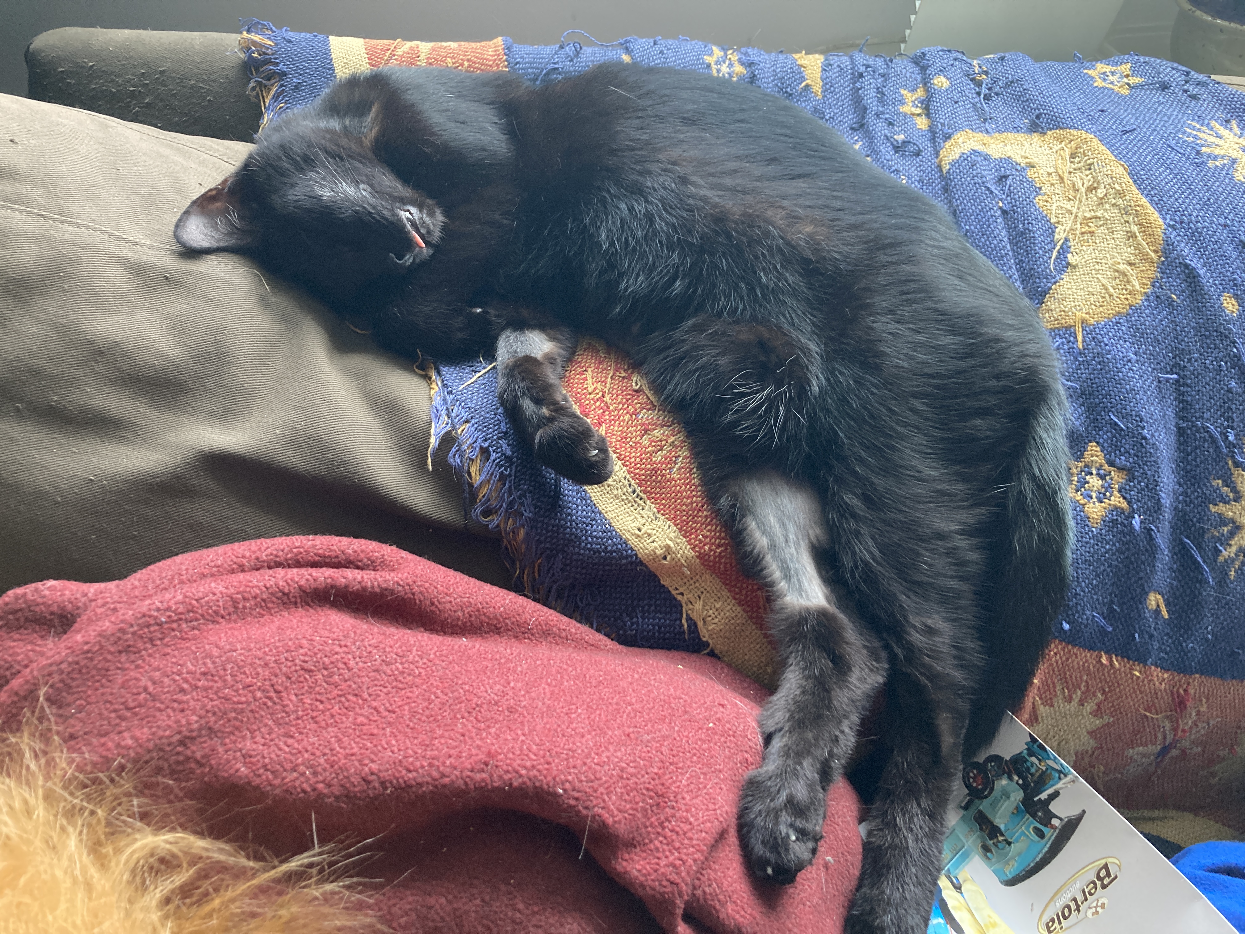 Cookie wanted her breakfast and Blackie is hiding – evidently he somehow thinks an overnight guest might result in him being placed in a carrier and going somewhere! I hate to say it but Cookie visibly expands when Blackie isn’t around. She is rolling on the floor and talking to Kim while he does his morning exercises.