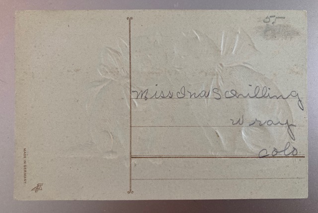 Although unstamped the back does have childish writing in pencil. It says, Miss Ina S Chilling, Wray, Colo.