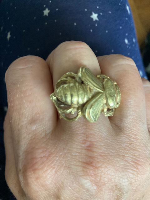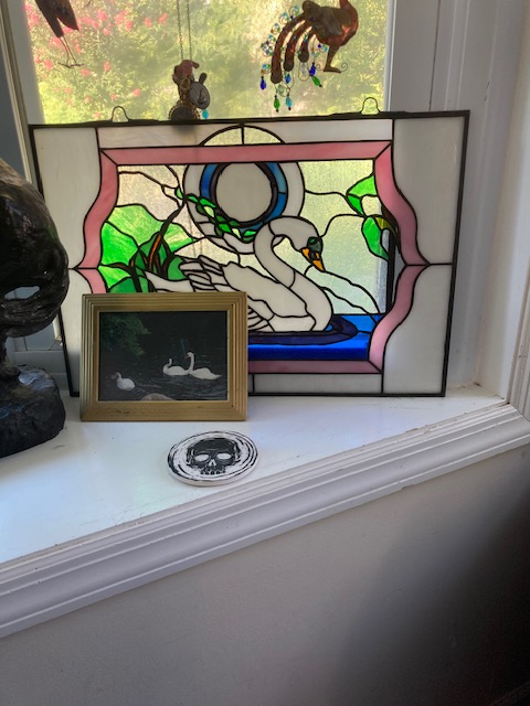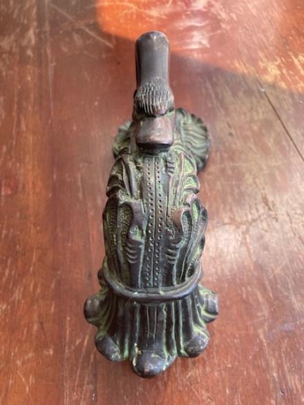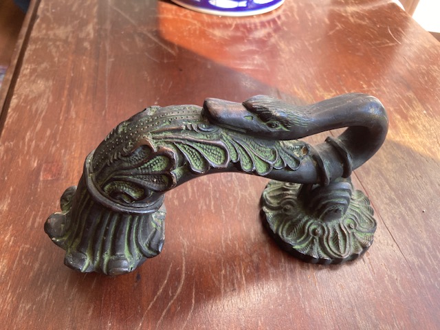 Anyway, they replaced the bit that holds the bulb and now I just need the hardware for the shade and a shade. While it isn’t exactly light, it is not as heavy as it might look. It’s sort of a dotty design and the ageing patina improves its appearance I think. I continue to think it might have a place in the bathroom. (Although I recently purchased a night light for it and it seems a tad less pressing than it did.)