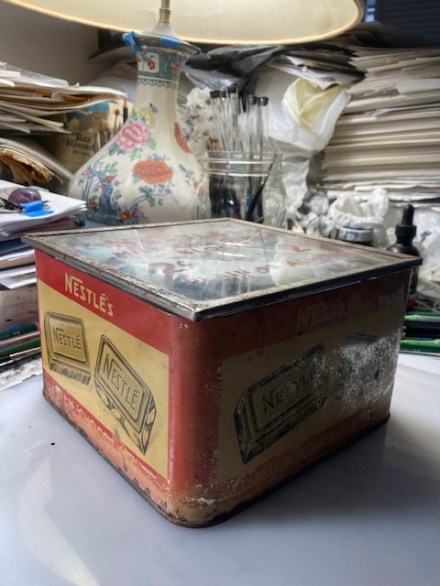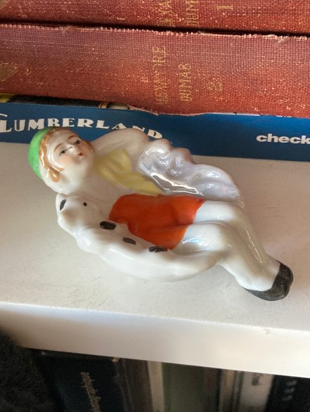 Anyway, they replaced the bit that holds the bulb and now I just need the hardware for the shade and a shade. While it isn’t exactly light, it is not as heavy as it might look. It’s sort of a dotty design and the ageing patina improves its appearance I think. I continue to think it might have a place in the bathroom. (Although I recently purchased a night light for it and it seems a tad less pressing than it did.)