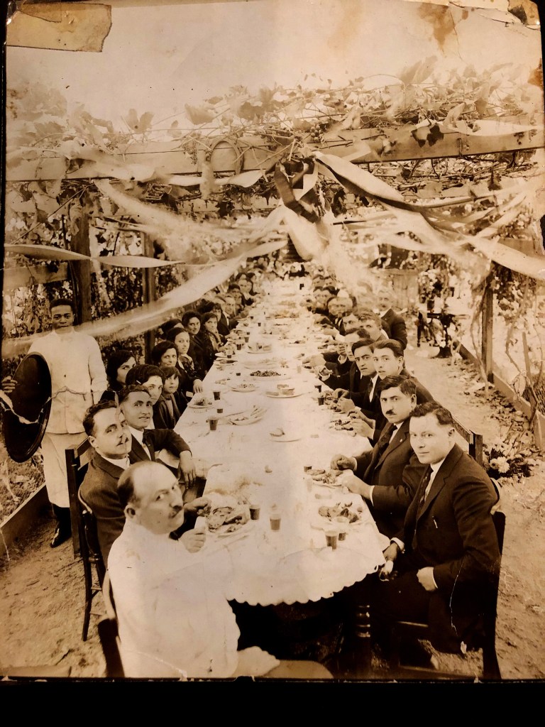 An undated photograph of a wedding feast in what I knew as my grandmother’s yard. The grape arbor, in keeping with the food theme, was gone by the time of my childhood.