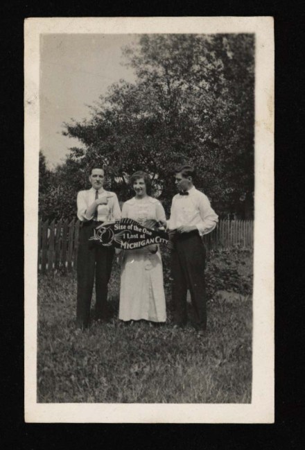 Pam’s Pictorama Photo Post: The fun and jauntiness of this snapshot caught my attention, probably from the teens judging from her dress. The large fish sign she is holding proclaims, Size of the One I Lost at Michigan City. One imagines that it was a photo op you were offered as part of a fishing trip package. I never thought about it, but fishing is a long-standing, major tourist attraction for Michigan, and a quick internet search turns up a thriving charter fishing industry. It makes sense that where there are enormous bodies of water there would be fishing.