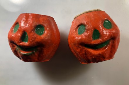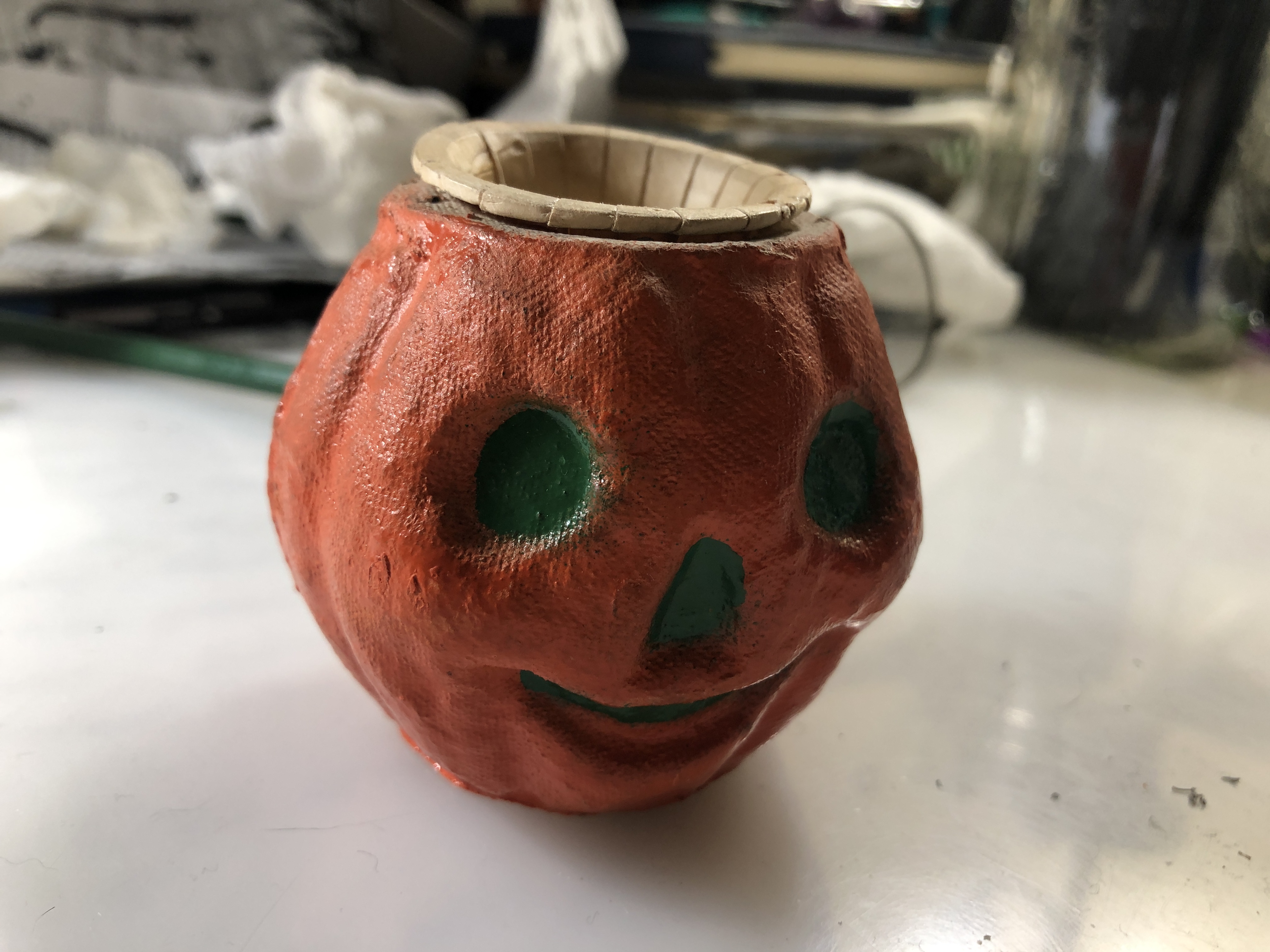 These candy containers are miniatures of the larger ones kids carried to collect candy in. Like my cat version below, they would have paper inserts for eyes. (A post about that acquisition can be found here.) Until recently I thought these were meant solely for decoration, but recently I have seen period photos of kids carrying them for candy filling purposes.