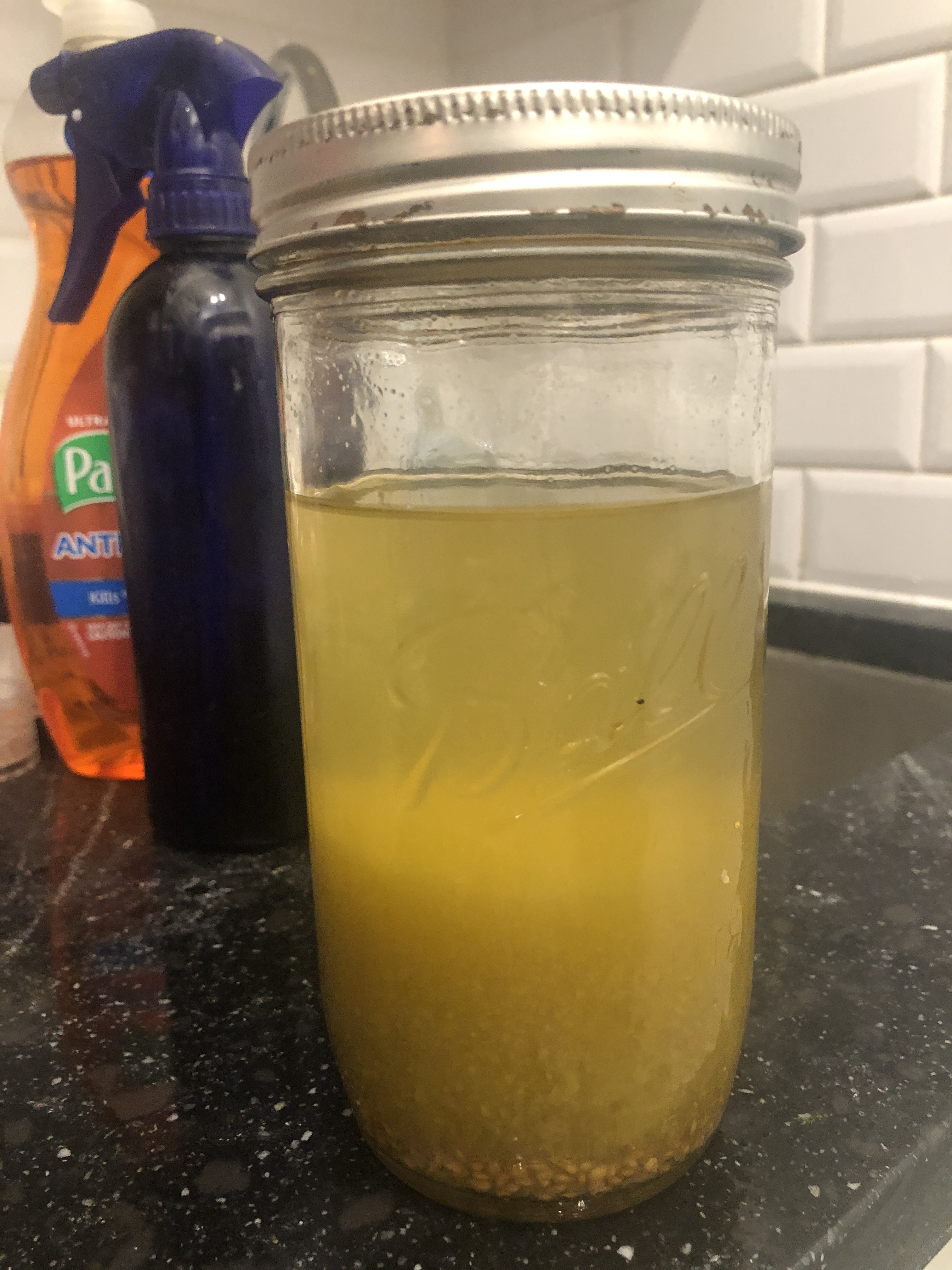 To start, for those of you who have not experienced it, tomato water is the water you drain out of tomatoes. This is sometimes done before canning or cooking tomatoes down in recipes. The result, assuming you like tomatoes, is drink that is like a wonderful burst of summer in your mouth. Liz introduced me to this delight, made me a fan and always includes a mason jar of it. This one is yellow – and tastes of those different tomatoes. Still very yummy and a real treasured reminder of summer as we head into a darker, gloomier season.