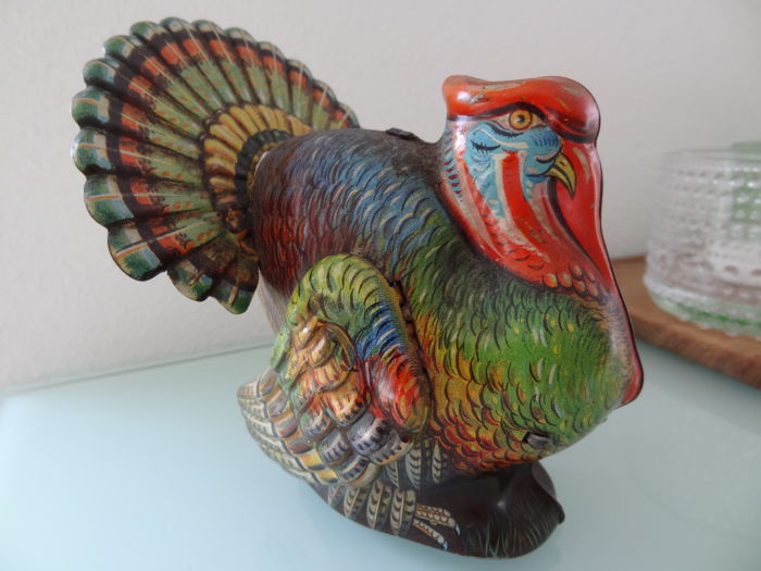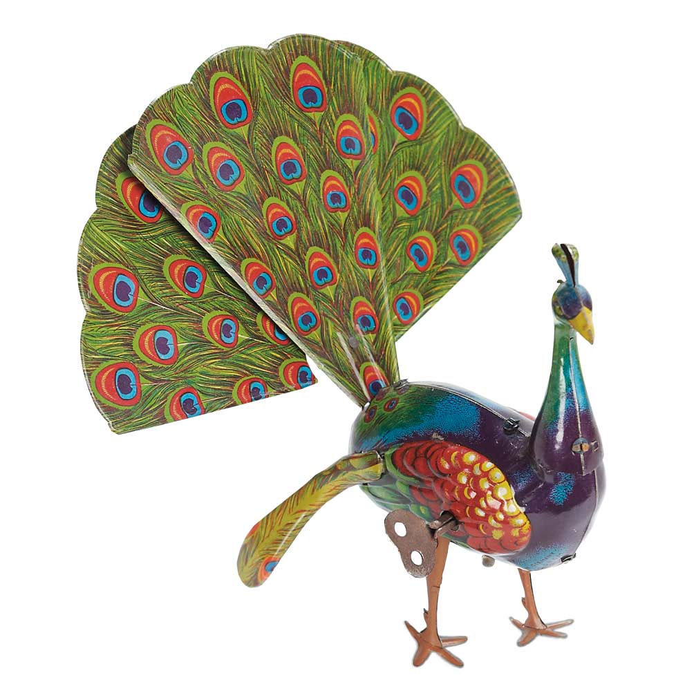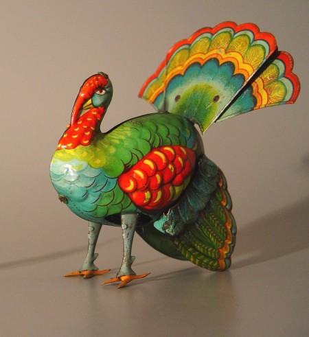 He is the earlier model of at least two that I found online (see further below),with greater definition and better action than the later one. There is something wonderfully Art Deco about the colors and design of his tail feathers that I especially like as well and what attracted me in the first place; his color is pretty glorious. Mr. Turkey is marked Made in the US Zone Germany on his tummy, which puts his manufacture in the mid-40’s to early 50’s. A Google search turns up an auction listing which mentions it was produced by Blomer and Schüler (or Bloomer and Schüler), a company founded for making parts in 1919, but which started making its own toys in 1930. It had an early hit with a Jumbo Elephant wind-up toy which is described as running. I have a weakness for elephant toys so I may need to investigate this more closely. Toys do lead to toys and a good wind-up toy is just the jolliest thing I can think of. (There is also a very hotsy totsy peacock too, but I must say, his mechanism looks even more fragile than Mr. Turkey’s.)
