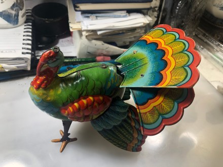 Pam’s Pictorama Toy Post: Toys today again with this terrific turkey. This item made a rare route to Pictorama a few weeks ago by way of Kim posting an image of it on Facebook which was so glorious I went in search of the toy. A quick search turned one up in good condition on Etsy and he landed here a few weeks ago. Unfortunately, a tiny bolt on one side of his tail went missing, either in transit or the seller neglected to mention it. Kim has done a short term repair with a tiny bit of wire from a twist tie off a loaf of whole wheat bread. Click below for our best effort on filming him – we got his tail to stay together sufficiently to get him moving on film, but I don’t think he has a ton of runs in him. Watch the video through, the full rise and spread action of his tail is what makes it great!
