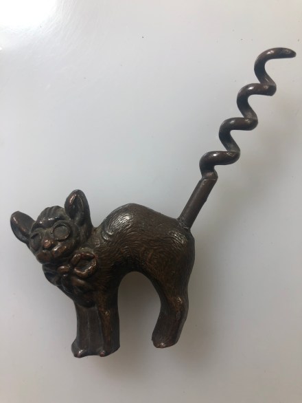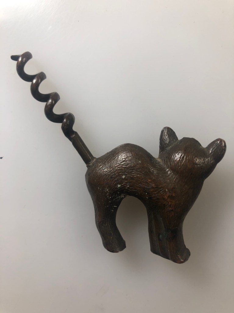 There’s something perfectly appealing about this kitty and his corkscrew tail, sticking up in the air. This little fellow (or gal) sports a big bow, an arched back and a slightly wide-eyed expression. He (or she – despite the big bow I’m feeling he I think though), has nice heft and stands well on his own. He is easier to hold and better designed (and to pull on) than you might think, although I find this kind of minimal opener requires a sort of brute strength I don’t have and ultimately leads to bits of cork floating in my wine. Therefore, despite being quite sturdy, this fellow is officially retired from the work of cork removal as far as I am concerned. I am eyeing a cabinet which I think he will be quite at home in.
