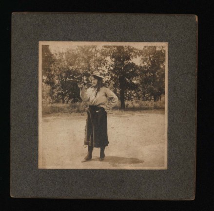 My guess is her shooting riding regalia is her own, however clearly she is mugging for the camera. I like her get-up though – perky little cowboy hat saucily askance, neckerchief, divided skirt for riding. Who wouldn’t enjoy such a get-up? Clearly, she is heavily Annie Oakley influenced. I know absolutely nothing about guns so I cannot venture an educated guess whether she is holding it correctly or just for the camera.