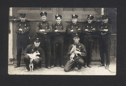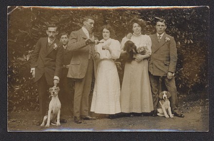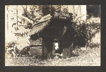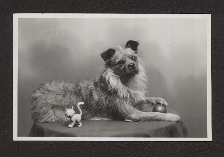 In this process I should admit that one photo has come to stay (an occupational hazard – more on that one in a future post) and I thought this one rated the Pictorama treatment. In this card a big footed fellow appears here in straw boater and spiffy collar better suited for a summer outing for the 4th of July than Christmas. A quick search tells me that this image was first distributed in 1906. The ultimate recipient of this card has smaller dogs but I think will like this early guy’s style.
