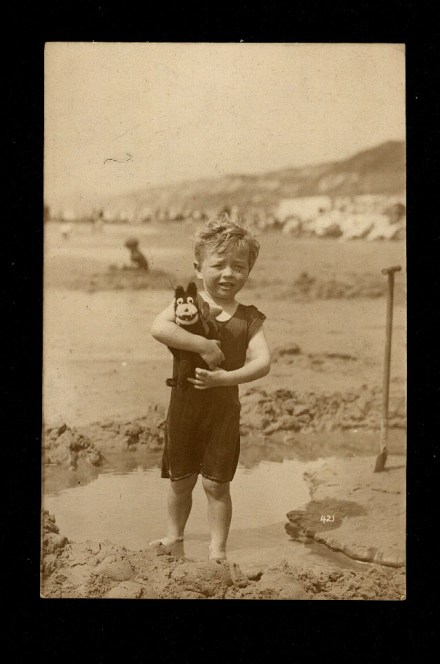 Pam’s Pictorama Photo Post: Those of you who are regular readers (or among Kim’s Facebook friends) will know of my ongoing passion for photos of Felix as a prop for beach photos. It is pretty much the cornerstone of my photo collecting, and makes up the bulk of my collection. This is one of two recent acquisitions in this area and I especially like it because the Felix toy does not appear to be a prop just for the photo. Instead this seems to be a much beloved toy, taking a trip to the beach with this little boy who is grasping him firmly in his arms. (Understandable – Felix does have a tendency to run off. See my recent post, Felix on a Leash for more on this. Felix joins another family photo in Felix Family Photo.) Written on the back, Dear All – hope you are all well having a nice time weather glorious – Best love to all Ronie. (Could also be signed Rorrie.)Oddly, there is no stamp or postmark so if it was mailed it was in an envelope. Therefore, no date either. We’ll have to assume that Ronie/Rorrie expected that everyone knew the little nipper on the front of the card and did not comment on him, or Felix, in particular.
