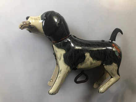 His only marking is Japan on his tummy and like yesterday’s ducks, he has a permanent key there as well. As you can see from my very amateur video below, when wound his tail goes in circles and his head bobs gently up and down. His ears are jointed, although the ears and bone only waft gently with the motion, creating a sense of doggy delight when he moves. He more than suits the requirement of toy joy resulting in purchase. For all the world, he is a vision of a happy dog with a bone I think and I say welcome to the largely feline family.