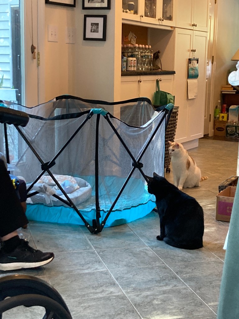 Mom’s cats keeping an eye on tiny Ariel who seems indifferent – or maybe even ready to play.