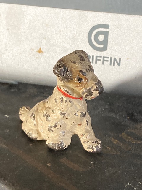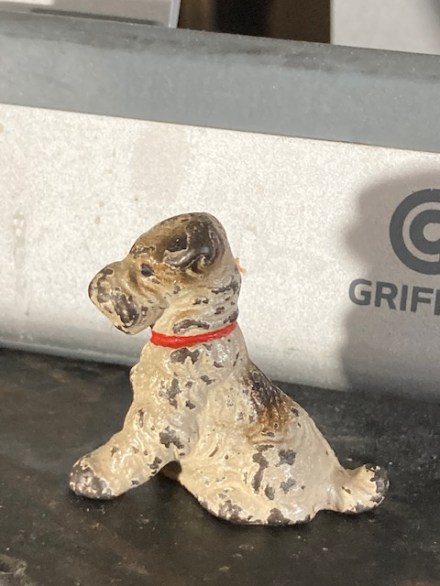 Kim bought me this little metal painted fellow at an antique store in New Jersey over the Christmas holiday. I like his erect, watchful attitude. Despite his paint loss, he is still a chipper white with a jolly red collar and somehow still has a little gleam in his eye. He’s got a nubbin of a tail. From one profile he looks ready to play and from the other side more guard pup. I sort of wonder if he was considered a toy or if he was more of a collectible even in his day.