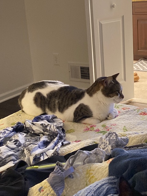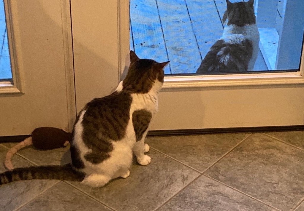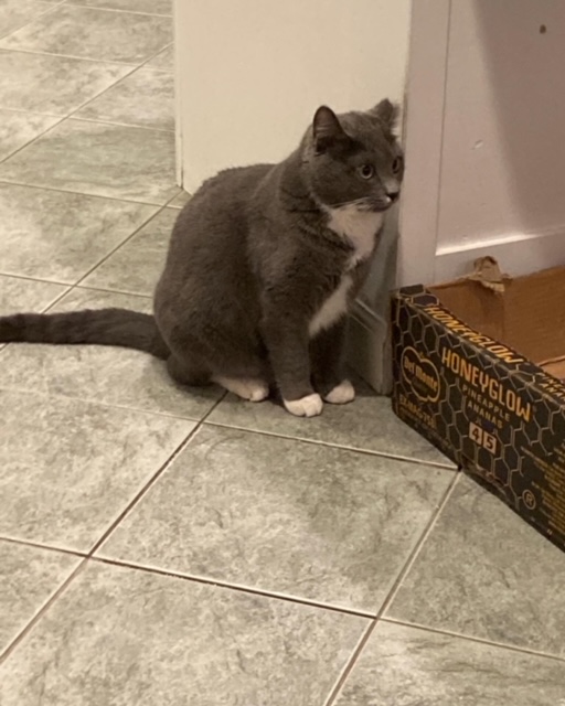 I can’t remember precisely when Hobo showed up except that I believe it was after mom adopted Stormy, a gray and white kitten who was also being fed at the backdoor. Like my mom’s other rescues, she showed up persistently and was looking increasingly poorly when mom trapped her with the intention of spaying and releasing her. She turned out to be a very shy, but good natured kitty and she never returned to the outdoors. (She still chases her tail, like our Cookie!) Therefore, Hobo probably came into the fold around April of ’22.
