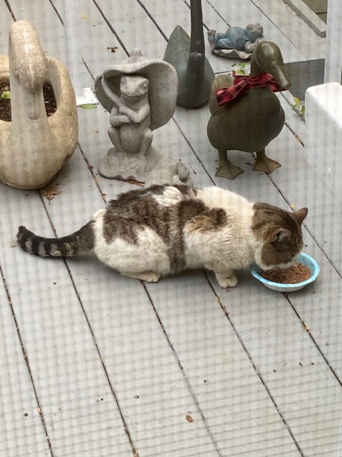 Sadly, Hobo seems to be on the lamb these days and hasn’t shown up in more than a week. Winsome reports daily and has tried leaving food out for him in case he is visiting at odd hours. It isn’t the longest he’s been gone and I believe (hope) there are other folks in the neighborhood who feed and look out for him. (We’ve seen him picking his way, very dignified, through other yards and down local streets.) We are decamping for several weeks in New Jersey and I am hoping he reappears then if not before.