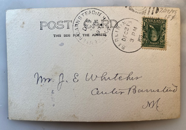 This card, as is declared decoratively at the top, was sent on December 21st, 1905 from Berlin, New York. After some serious study, it appears to have been sent to Mr. J. E. Whiteker in Barnstead, New Hampshire. (There’s one word I can’t quite figure out – center? outer? Barnstead.) There is also a notation in pencil in the upper right corner, 7/27/75 15¢.