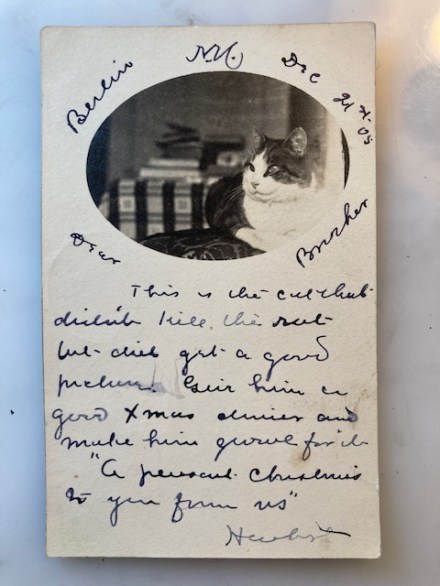 The message on the card appears to read as follows, Dear Brother (?) This is the cat that didn’t kill the rat – we didn’t get a good picture. (Serve?) him a good Xmas dinner and make him grovel for it. “A personal Christmas to you from us. Herbert. Clearly a message of great holiday cheer.