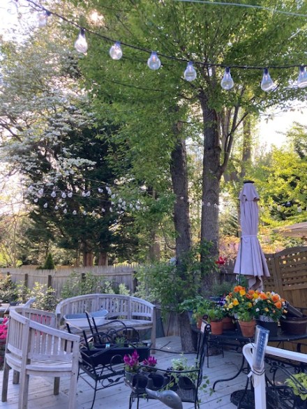 Dusk on the deck with the fairy lights on. Deck (and lights) had to be completely redone last fall – boards were all rotted! This is my first evening of return on investment! Well worth it.