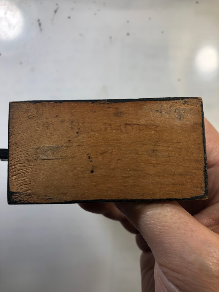Pam’s Pictorama Post: I am crazy about this odd little item I purchased recently. He is about five inches high and constructed with a thin sort of wood. I believe he is homemade, but very nicely executed. There is an odd little knot in the wood atop one eye which mars the overall effect a tad, but generally a job well done. He is only painted on one side, his back is all black. (Something was written on the bottom, but it has faded beyond reading. Part of it appears to be some numbers, but they don’t make sense as a date.)