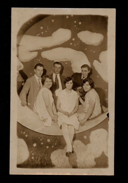 That roguish fellow with pet notwithstanding, our photo participant posers are a fairly serious looking group. Two out of three women are smiling – the woman in the middle isn’t and I don’t know why because she has the best spot, smack in the middle, white stocking legs, ankles crossed, hanging right over the edge of the moon. The photographer had a good eye for this set up and composition. It is a bit faded, one imagines that the developer used was probably well into its long day of use.