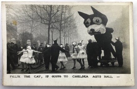 Meanwhile, the Chelsea Arts Ball dates back to 1891, as far as I can tell from a brief history on the website of the club, (found here – and note the image of Felix on the side of their building in the photo!) having grown out of a tradition of fancy dress parties in the studios of artists in the 1880’s. It was meant to rival the already established Arts Club of Mayfair. (A side note that women were not admitted for membership in the Chelsea Arts Club until 1968!) The balls typically seemed to take place over New Year’s and/or Mardi Gras and eventually settled in at the Royal Albert Hall as a venue for a decades long run until the 1958 one was so raucous (Wikipedia sites, rowdiness, nudity and public homosexuality – which was illegal at the time – as what caused the ousting) that the ball was banned from the venue for the next 30 years. If I understand correctly, I believe that the party tradition continued until December of 2020 when, for Covid reasons, it was banned. The parties have been held at the site of the club at 143 Church Street in recent years.
