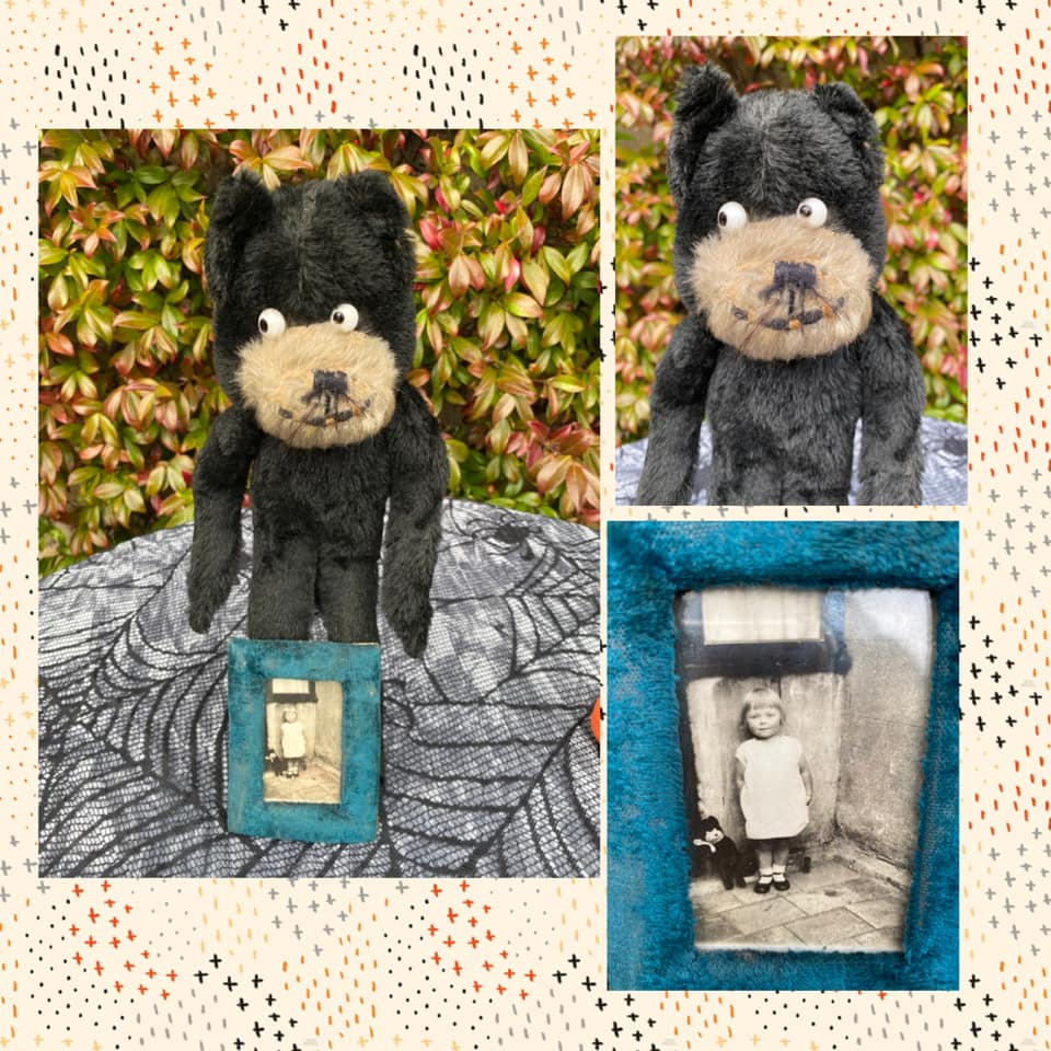 One interesting (and rather splendid) feature is that Peter and his wife seem to have photos of children with the dolls they are selling. Someone who shares my interest in the photos as well as the toys! A brother from another mother it seems. I show one of their other offerings below, this currently for sale on Facebook and a group holding a sale under the name 200 Years of Childhood which can be found here, or under Leanda Harwood Bears. As it happens, I own this Felix below (or a kissin’ cousin anyway) so he wasn’t in the running for me. You might remember an especially interesting post about how these off-model Felix toys were made in an East London factory as a way of employing indigent women. That post of mine can be found here.