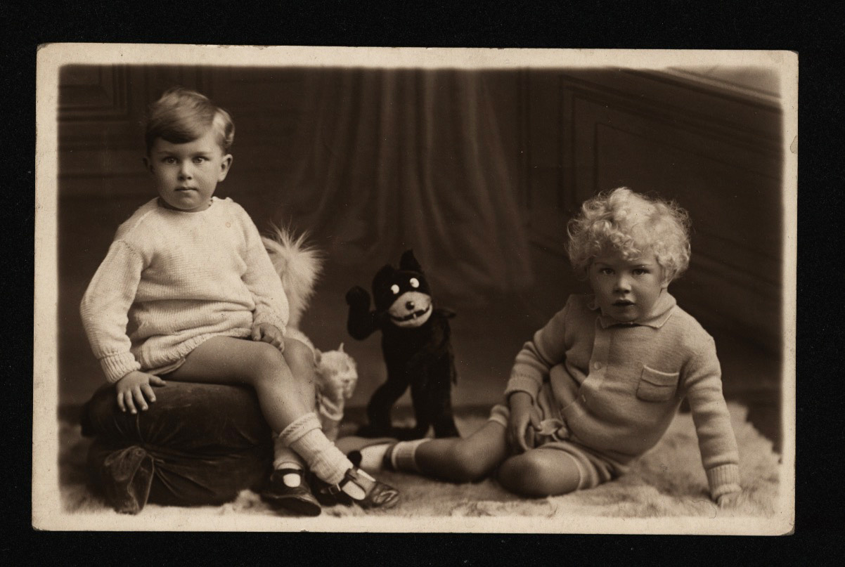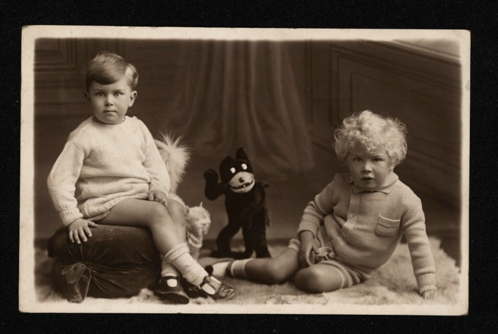 These little boys are posed on a fluffy carpet and they (and their parents) may think they are the center of attention, but of course we know it is Felix, whose eyes are rolling comically to one side as he leans toward the little boy with the straight hair. It is as if the photographer and Felix are playing a joke on these folks, which comes to us decades later. Felix steals the show, upstaging these albeit cute kids. Of course, having said this, I would have loved to have been a child posing in a photo with Felix and have that relic, but I won’t hold the lapse against Mom and Dad.