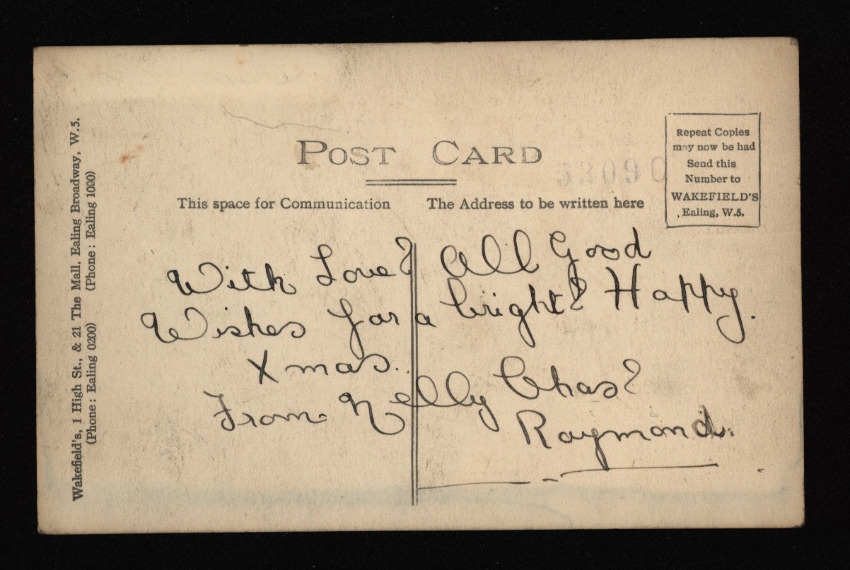 On the back of this card, written in a loopy script it says, With Love & All Good wishes for a bright & Happy Xmas from Nelly Chas & Raymond. There is no date and this was not mailed. The card, which offers how additional copies could be acquired on the back, appears to be the product of Wakefield’s, 1 High Street & 21 The Mall, Ealing Broadway, W5 with a phone number. A quick search reveals that Wakefield’s was a noted Victorian photo studio and that Ealing seems to have been an area with a number of photography studios at the dawn of the 20th century. (A website devoted to researching this topic (What’s That Picture?) can be found here, but note that this fellow blogger appears to be focusing on earlier photographs, only up to WWI. (A not especially interesting modern building exists at the address now according to Google.) One interesting tidbit was that this, evidently very substantial, studio also had a branch in Brighton – which is, in my mind, definitely Felix photo territory.