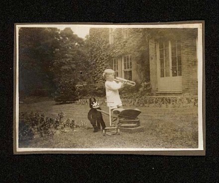 As the little boy doesn’t actually interact with Felix I wonder a bit if it is indeed his affection for it that has placed it in the photos or some other more general family fondness for Felix? Maybe the person behind the camera. It is a nice big Felix (one that I would be pleased to have I might add) and he comes up to the little fellow’s waist. I especially like the way he is looking at the little boy playing the horn, the tiny wheelbarrow (child-sized) makes a good counterpoint, the beautiful old stone house in the background. A miniature lawn mower appears in a subsequent photo and, although those are somewhat lesser photos, the light is beautiful in them.