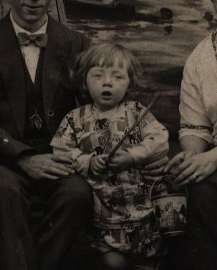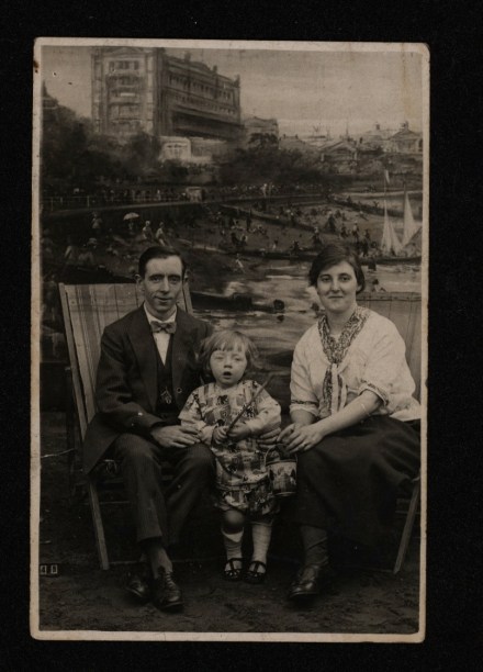 I must say, as backdrops go the photographer didn’t have much to work with here – the patch of sand and unromantic wall behind them. They could be anywhere. He has centered them however and consciously or not, they make up a good photo, their hats lining up and the little girl on the end just a bit taller than the seated adults. Something about the white stockings and shoes on the third woman adds something to the effect. If their repose was greater they might be the Whistler’s Mothers of Margate, but instead there is that nagging sense of diligence. Their Sunday afternoon in the parlor transported to the beach briefly.