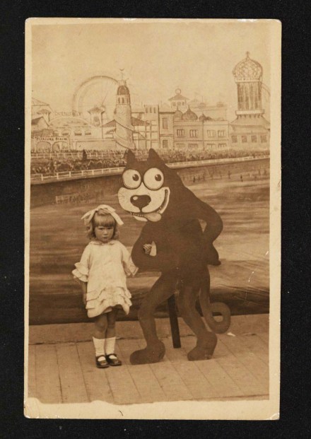 Felix remains jolly in the face of their dour and somewhat gloomy affects. He rolls his eyes a bit maniacally, looking up coincidentally toward the little girl – she is his potential partner in crime, and they are in it together to get this party started and have some fun! One arm (paw?) up, he’s ready to lead the way. Meanwhile, he is at the beginning of a long day of posing, cheerfully, with an array of folks on the beach in Margate, some more fun than others, waving to me a hundred or so years later.