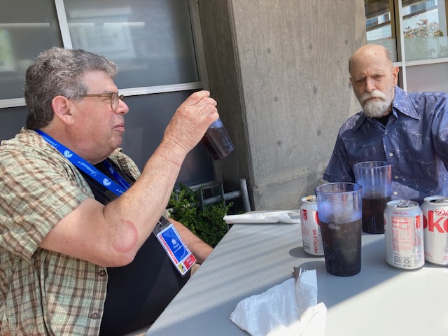 He has one remaining glass eye and that type of eye is pretty typical in the world of these toys, although many have the white felt behind black shoe button eyes instead. The brown stitched teeth are odd and I do believe they are brown not just discolored like the white on his face.