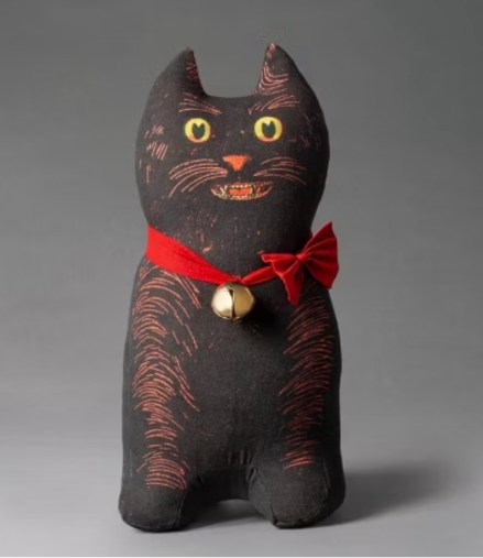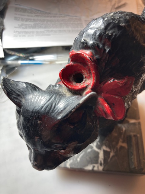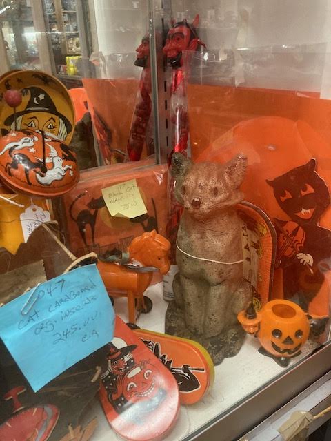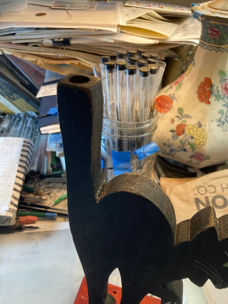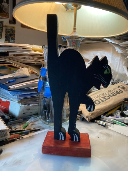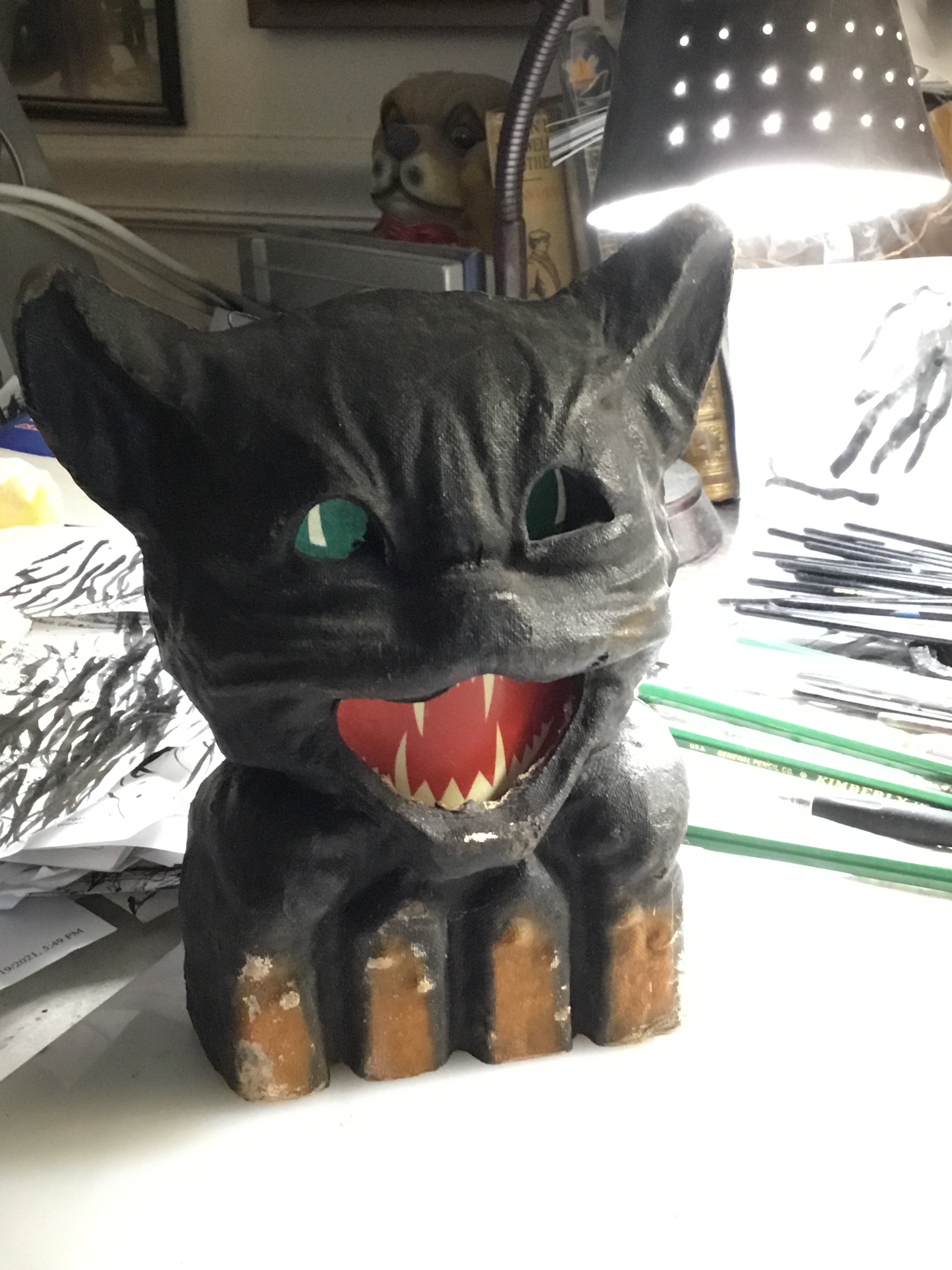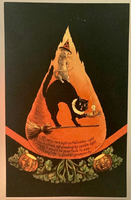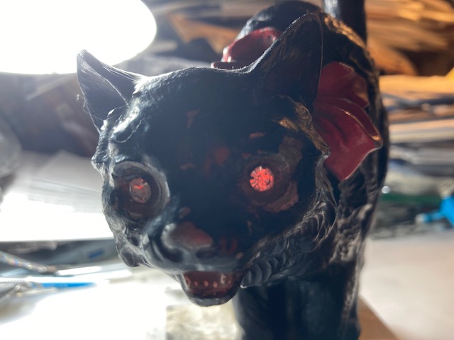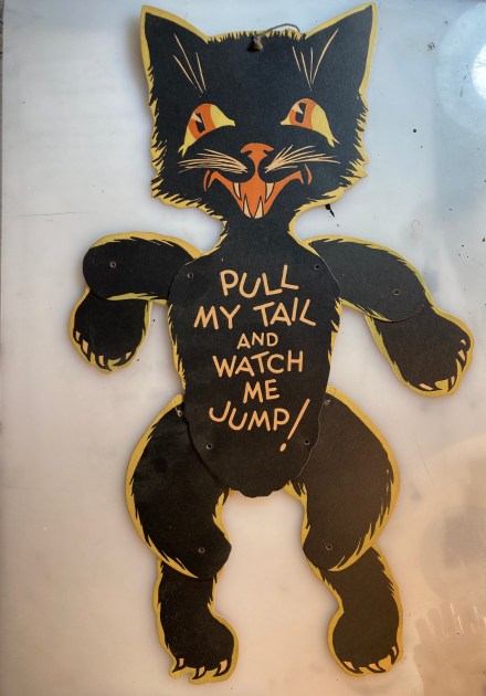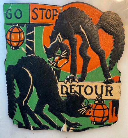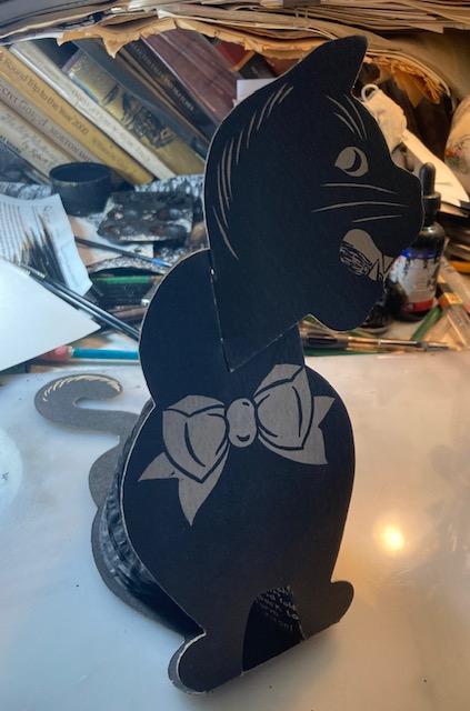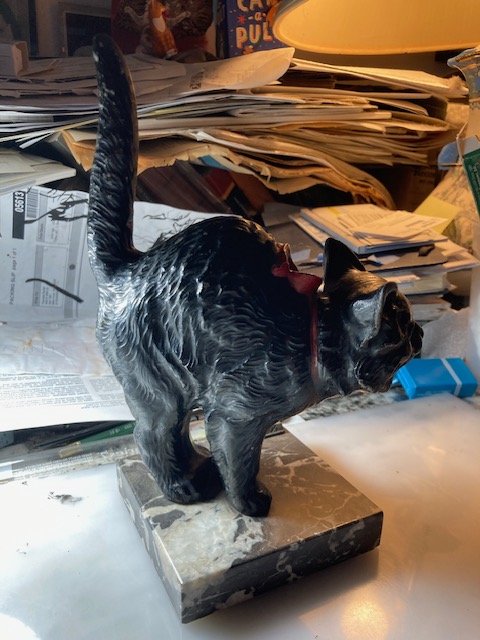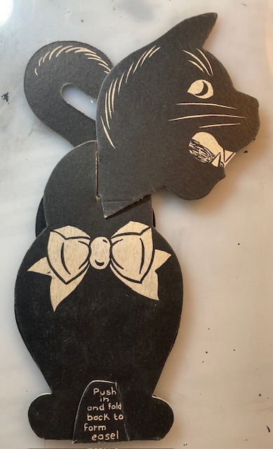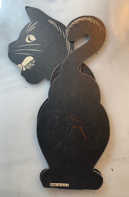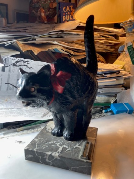 It is my intention to have him join another Halloween cat which has graced my office for many decades. I was working at the Met and I don’t remember how this couple knew that I collected black cat items, but they made a gift of it to me one day. Seems their son was a buyer working for Martha Stewart and was responsible for sourcing decorative items for the various holidays which would then be shown in the magazine and probably also sold under her brand. This cat had been a sample among the items he proposed and it was rejected. Somehow his parents saw it and grabbed it up for me.
