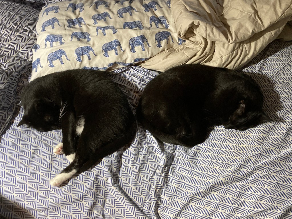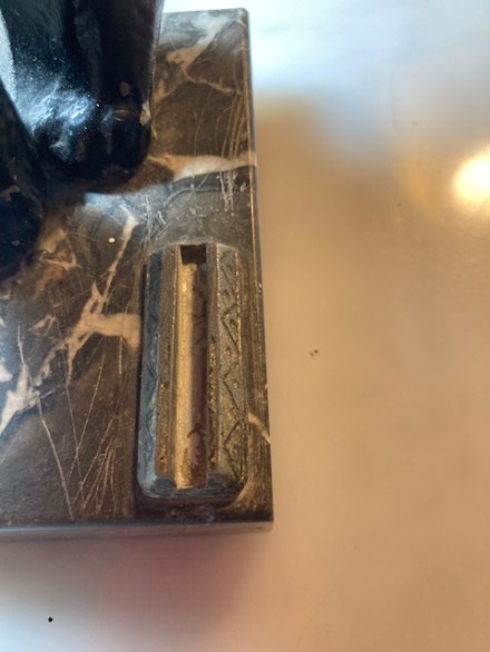 Both of these cats are made with a plastic arched cat body which is covered in black “fur”. The smaller older one (or one from my office, who knows the age of the additional one) has more wiry legs and you can almost pose him but I have never pushed it. Overall, this new fellow bigger and sturdier. Part of me wonders if he had shown up rather than the other if he would have made the grade with Martha. He is better made, although clearly from the same sort of origin.