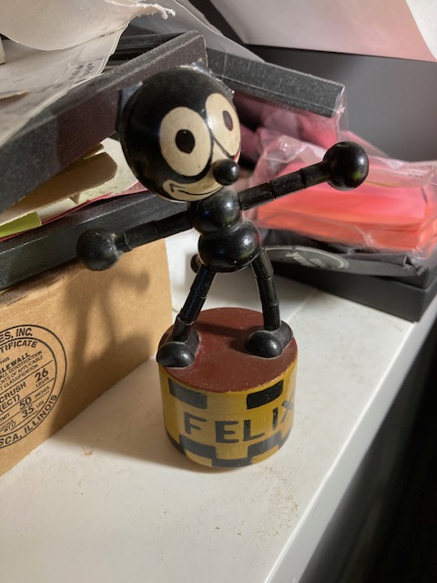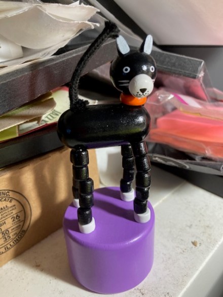 It has always been my office black cat if you will. (For many years I also kept the Happy Life wind-up toy, below, in my office because it has a calming and cheering effect on me. I was known to wind it up for staffers under distress, especially while at the Museum. I wrote a post about this soothing toy here and you can see it’s a clip of it wound up as well.) There has been occasional conversation about the scary black cat when he was introduced at various offices and why I have him and I usually just tell the story of his acquisition. However, over time for those staffers who have seen me on zoom from home they have been treated to a small view into the mighty black cat collection and it makes more sense. No one at the animal hospital has asked and I assume that has something to do with being an animal hospital? Or are they just not surprised to find me guarded by a scary black cat.