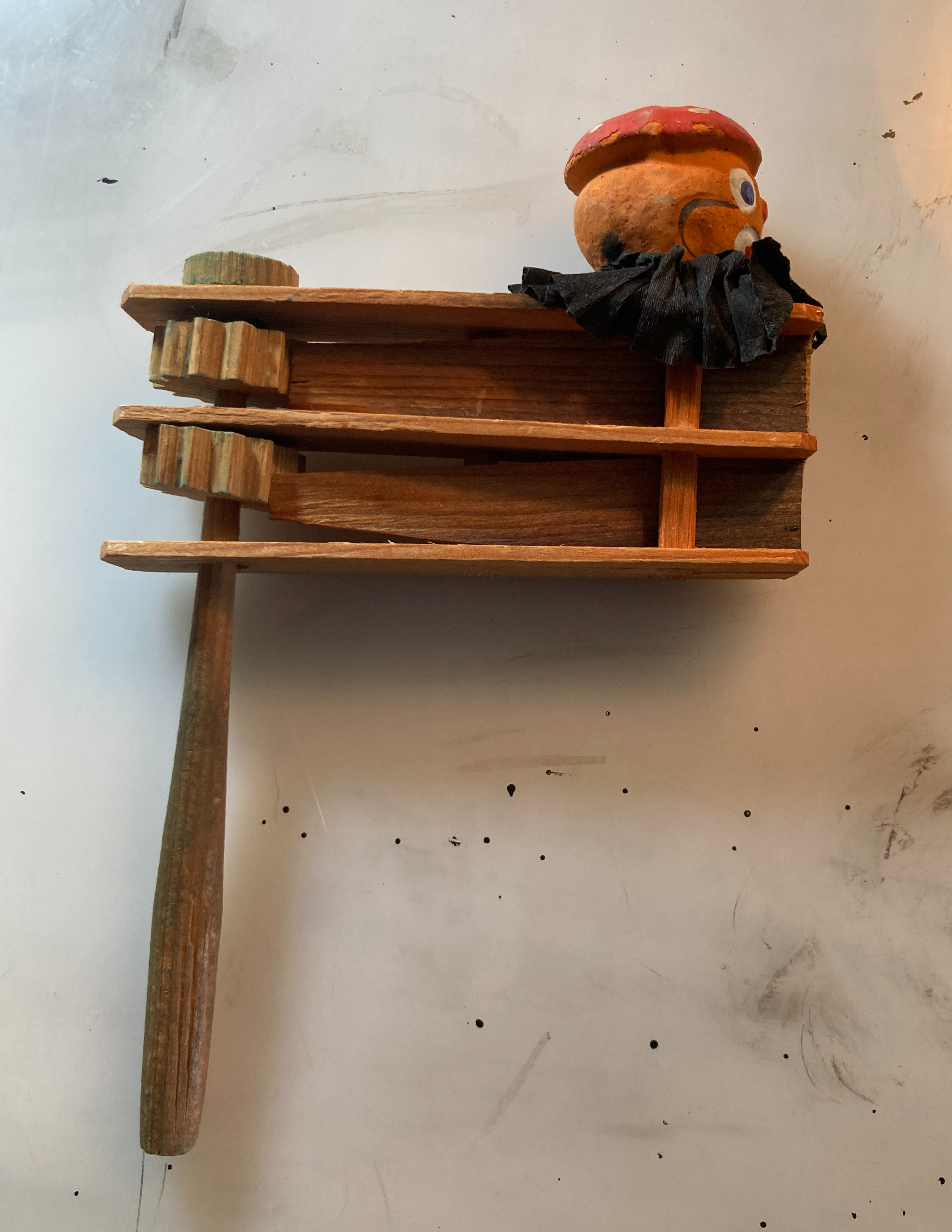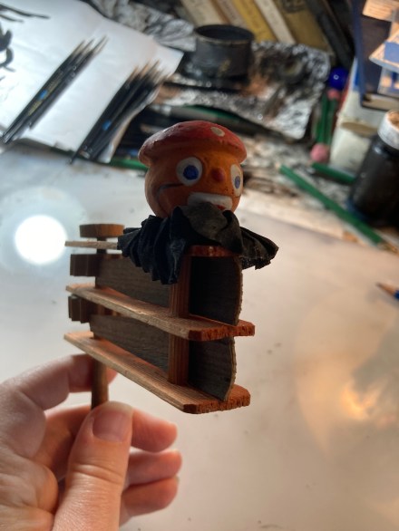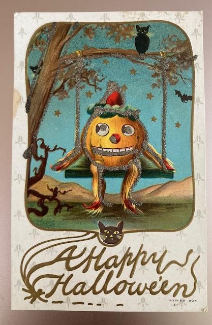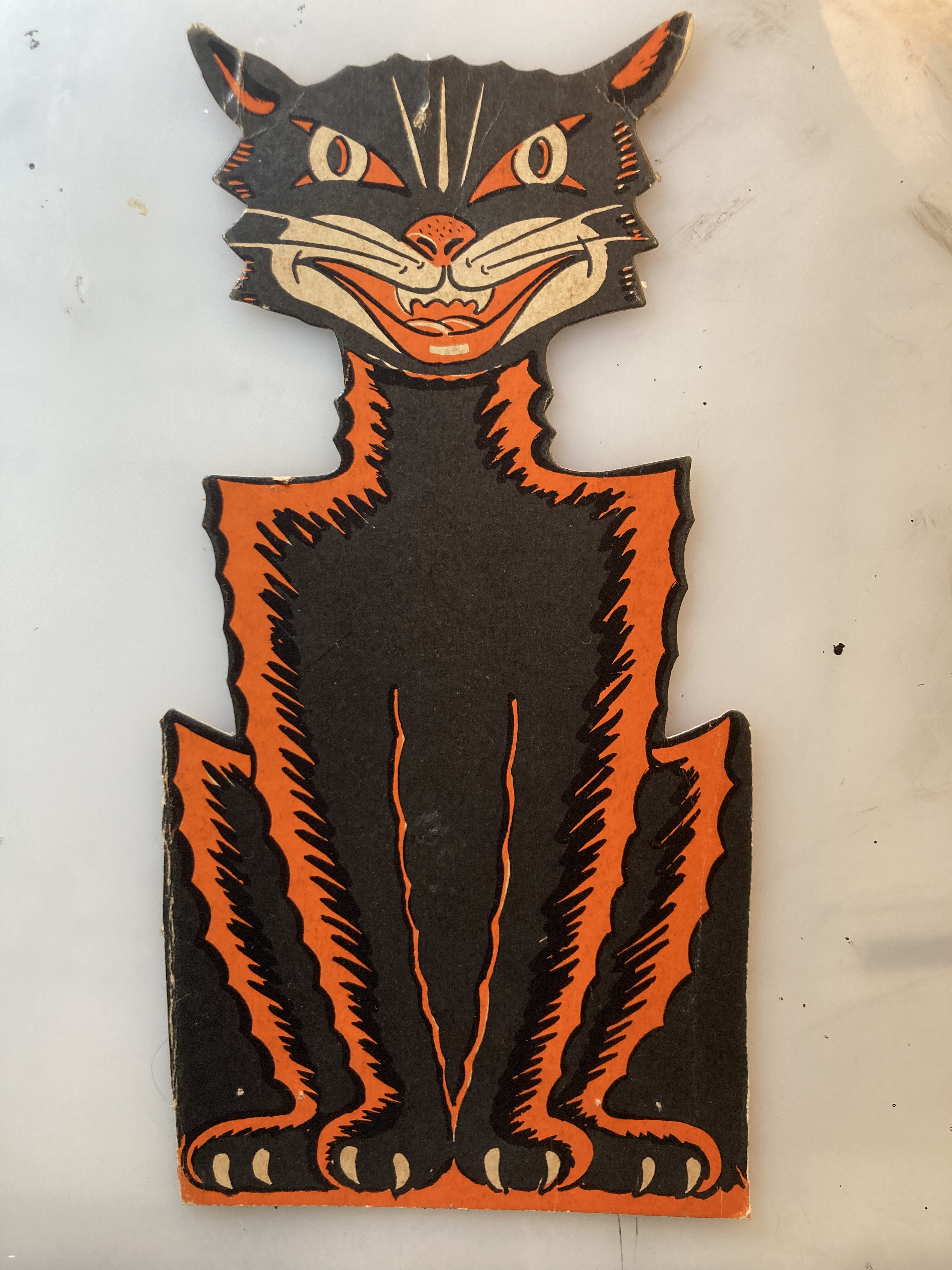 It is my intention to have him join another Halloween cat which has graced my office for many decades. I was working at the Met and I don’t remember how this couple knew that I collected black cat items, but they made a gift of it to me one day. Seems their son was a buyer working for Martha Stewart and was responsible for sourcing decorative items for the various holidays which would then be shown in the magazine and probably also sold under her brand. This cat had been a sample among the items he proposed and it was rejected. Somehow his parents saw it and grabbed it up for me.