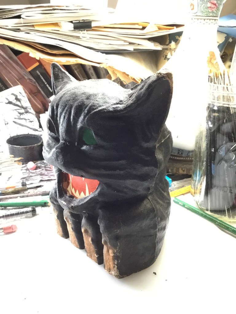 It is my intention to have him join another Halloween cat which has graced my office for many decades. I was working at the Met and I don’t remember how this couple knew that I collected black cat items, but they made a gift of it to me one day. Seems their son was a buyer working for Martha Stewart and was responsible for sourcing decorative items for the various holidays which would then be shown in the magazine and probably also sold under her brand. This cat had been a sample among the items he proposed and it was rejected. Somehow his parents saw it and grabbed it up for me.