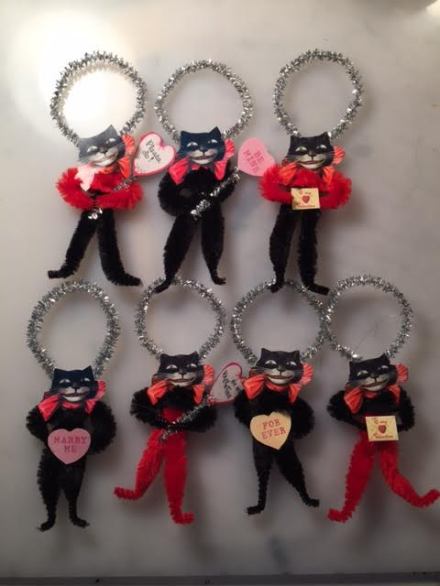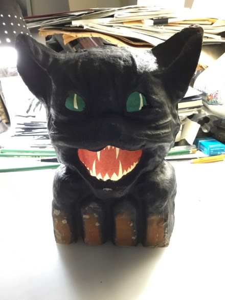 It is my intention to have him join another Halloween cat which has graced my office for many decades. I was working at the Met and I don’t remember how this couple knew that I collected black cat items, but they made a gift of it to me one day. Seems their son was a buyer working for Martha Stewart and was responsible for sourcing decorative items for the various holidays which would then be shown in the magazine and probably also sold under her brand. This cat had been a sample among the items he proposed and it was rejected. Somehow his parents saw it and grabbed it up for me.