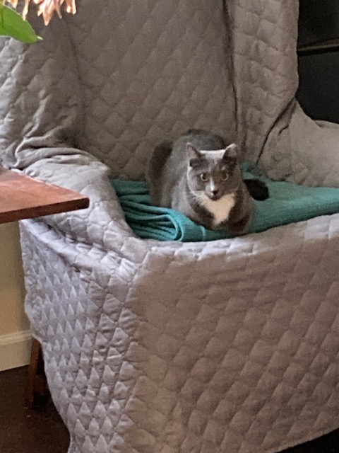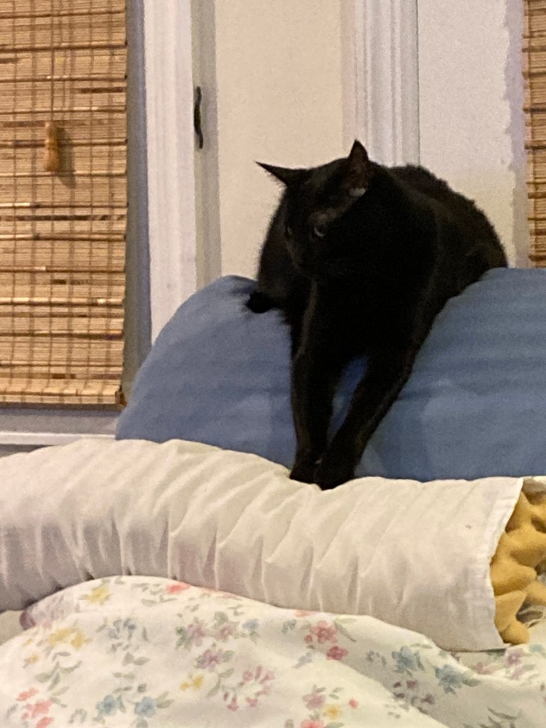 Cookie (shown above) and Blackie are thrown back together and I report that they are finding the one room small as well. Blackie, on the defensive the whole time he’s in New Jersey, gets unfortunately aggressive with Cookie once we are back. The fighting has commenced and there is much hissing. Kim is mostly doing the mediating. Cookie has resumed a perch atop of the couch and, although Blackie slept on the bed, he is currently sleeping off the whole experience under it. (Do they think they have awoken from a long dream when they find themselves back here? Or have they assimilated that they now occasionally travel back and forth? I suspect they’d have a lot to say given the opportunity. Perhaps we are just as glad they cannot talk!)