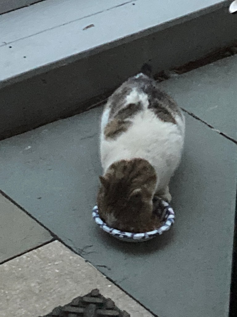 Hobo, our wandering dinner guest, gobbling 3 cans of food early yesterday morning for a second appearance in two days.