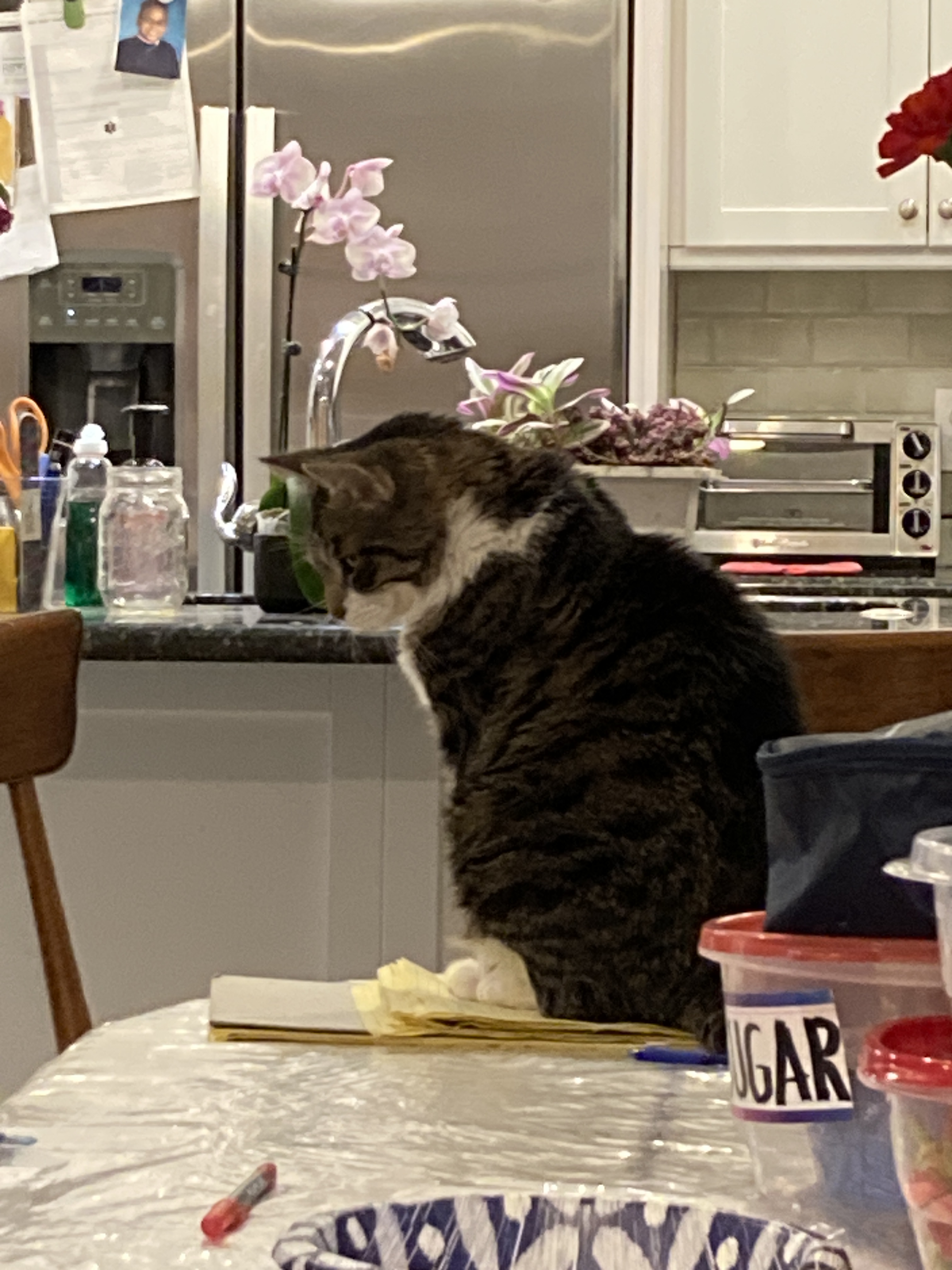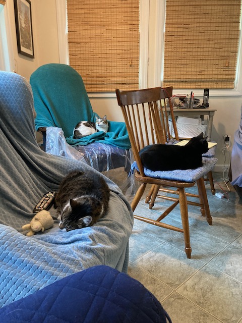 It is Thursday night and I am back in New Jersey. I worked remotely today and will spend tomorrow preparing for a repast for mom on Saturday – 40-50 people over several hours stopping by to chat and have a nosh. The resident cats are surrounding and circling me endlessly since my arrival last night.