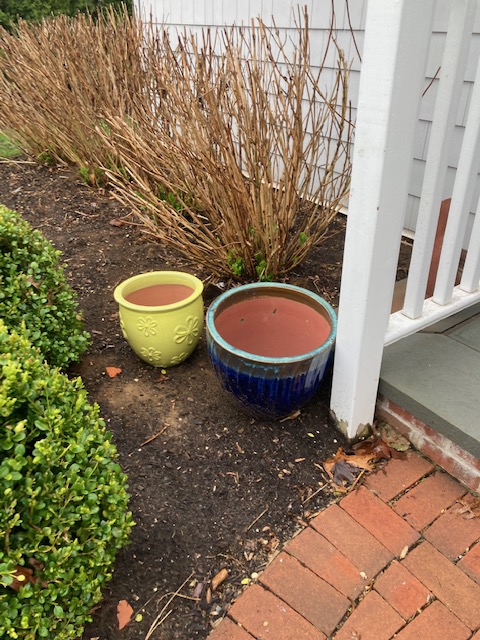 One day, while hunting down a cookie sheet in Home Goods for roasted vegetables, I was greeted by a pile of these wonderful blue pots and for a tiny fraction of the price. No two were alike so I chose two and brought them home only to realize that one is too small for that job. On my next trip I bought another larger one and placed it with the other, on each side of the front steps.