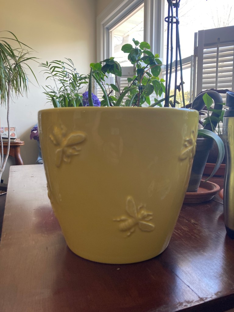 Later I added a yellow one to contrast with the blues. The smaller blue pot and another yellow one (with bees on it) will go on the back porch. The woman at the register during the first purchase spontaneously offered, “Great deal! You’ll never get them for that price at Sickles!” Which made me laugh – small town indeed.