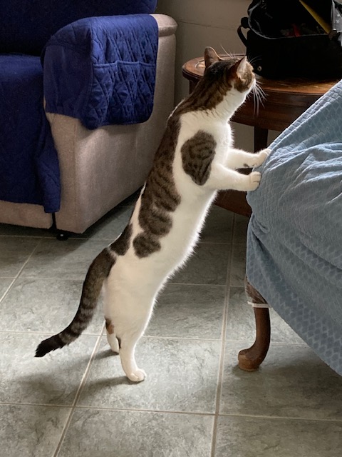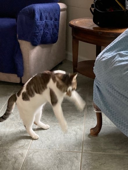 I keep a suitcase lightly packed, but mostly I have clothing, toiletries and running apparel there. Like me, my laptop has to be disconnected on one end and reinstalled on the other. On the other side of the trip is mom’s little Cape Cod house, a bedroom for me which the cats there only cede to me with great reluctance. I gave everyone a peek at Peaches in last week’s post which can be found here.