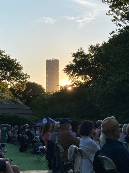 As the sun was setting in the west and the orchestra struck up the beginning of Rhapsody in Blue I looked around and realized that coincidence had it that I was seated with many folks I sit backstage with during countless concerts in the hall and elsewhere. I stretched out in my chair and watched the sparrows ready for the evening, a few bats. My eyes welled with the sheer pleasure. The weather and the night were perfection. It was the first time I felt like maybe we really are back.