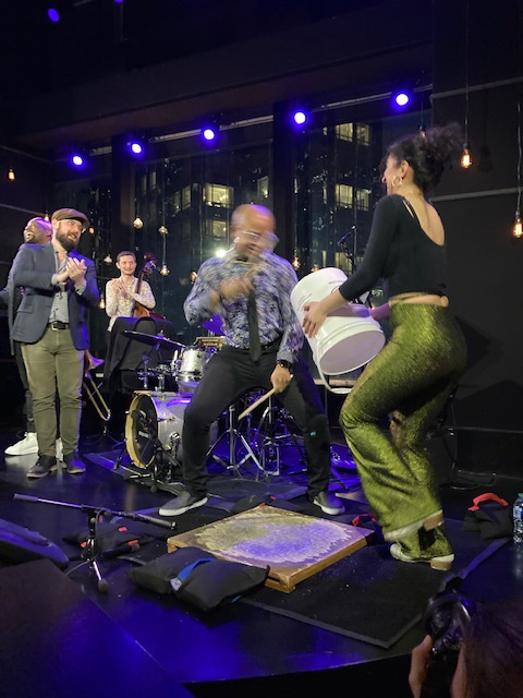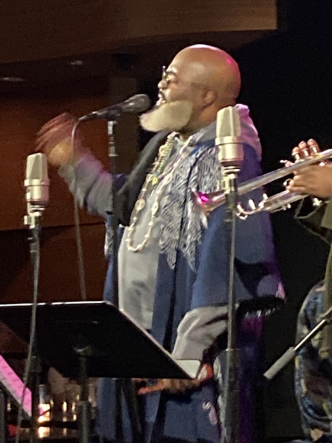Alphonso Horne’s Gotham Kings make an annual Mardi Gras appearance at the club and this year it could only be described as a raucous and joyous celebration of their return to Dizzy’s on Fat Tuesday after a two year online hiatus. When one of Alphonso’s trumpet players was unable to make the gig he engaged four others for a total of five on stage. Trumpet players called to each other from locations across the room as they emerged from the audience, kicked the show into gear and made their way to the stage where they joined the rest of the band and a tap dancer. (I do love a tap dancer!)
