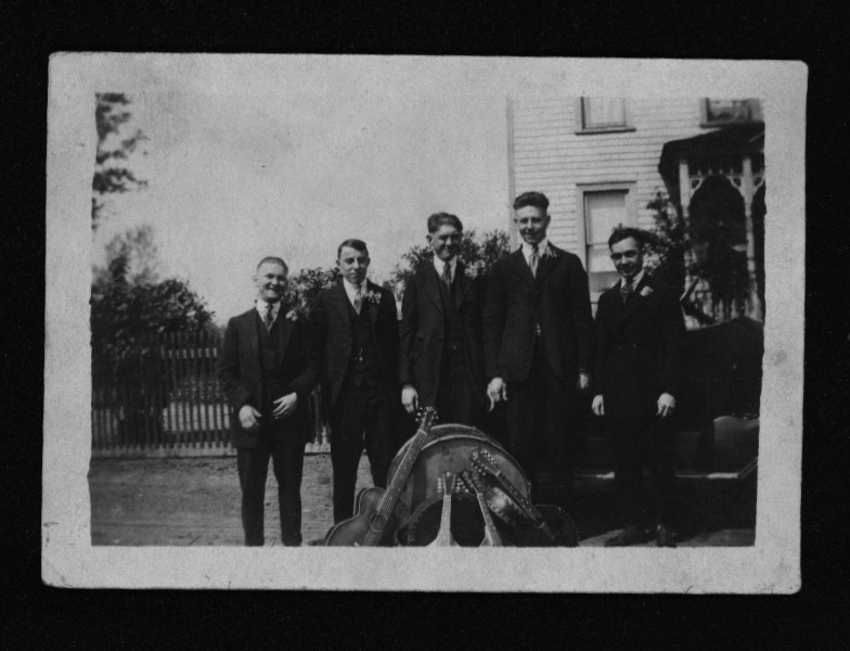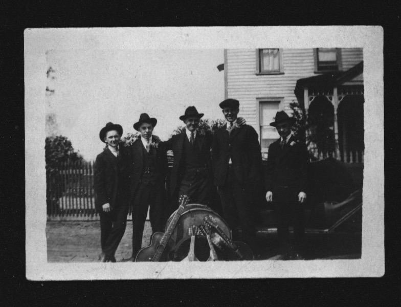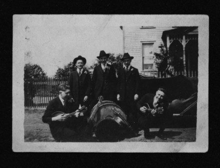 I have used my favorite of the three at the top of the post, with the two men holding their mandolins. A drum case and a large drum front and center, a banjo case is on the running board of the car. It would take a better forensic thinker to unpack with precision what year this might have been. The suits, the location behind them and the car could have belonged to a few decades. The printing of the photos and the film is fairly primitive, but those persisted for decades, especially for home use. We can’t quite see the car they are traveling in but it looks like an early roadster complete with running board.
