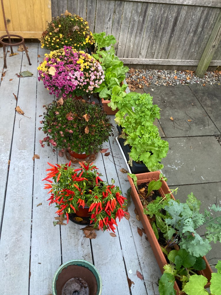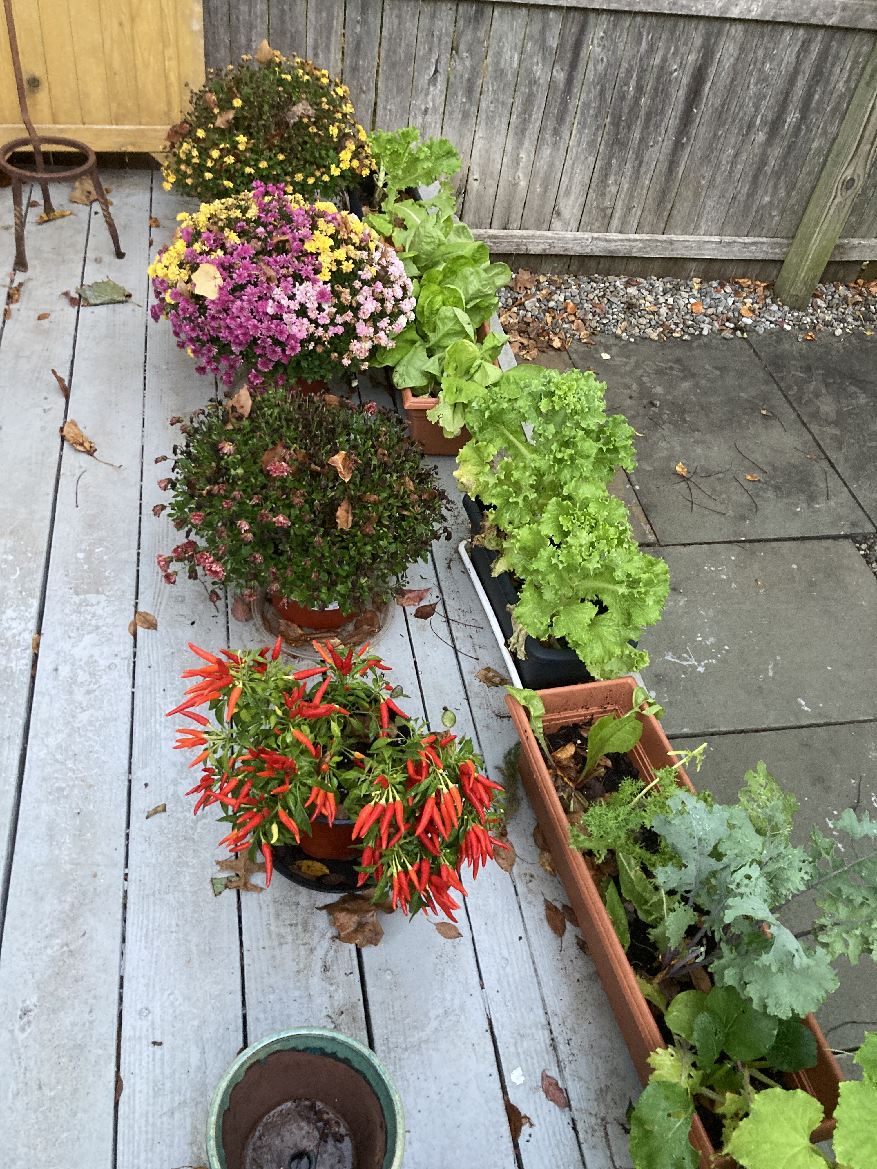 The tomato plants promise produce, hanging green on the vine but ripening SO slowly. Another producing tiny tasty yellow cherry tomatoes is doing a great business – unusually small but tasty bits being the order of the day here I guess. We pop small handfuls in our mouth, still warm from the sun. The jalapeno peppers are bountiful (and perversely huge) and of course are the hardest to use up quickly without killing my diners with devilishly spicy treats.