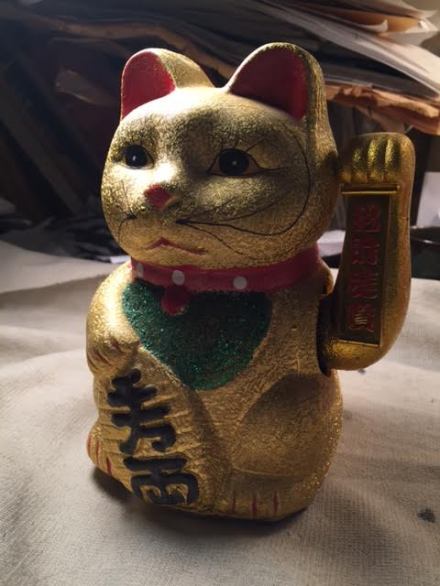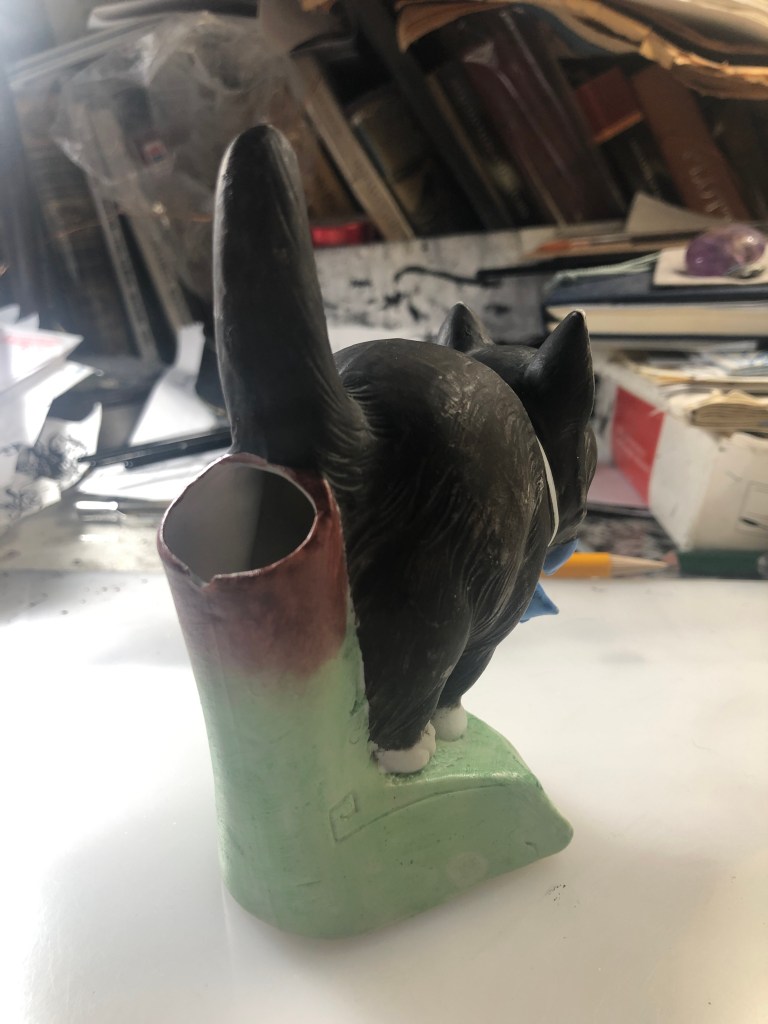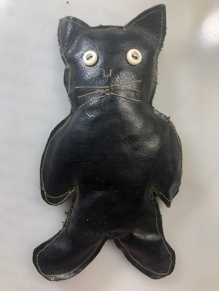 It is British and therefore the black cat is a lucky symbol – their horseshoe is also facing down whereas I think we usually portray it up (to hold the luck!) on this side of the pond. In addition to this smiling cat there is a four leaf clover, should we have any doubts. (There will be more about lucky objects coming next week so stay tuned.)